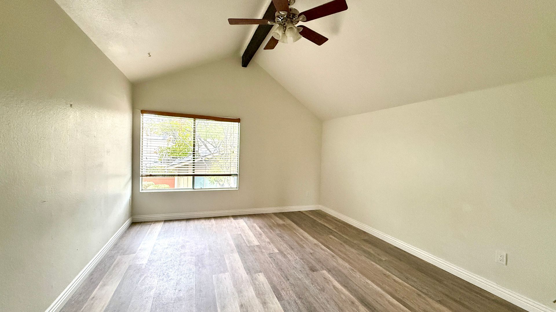 Expansive ceilings in the spacious living room with fireplace. Laminate flooring throughout. Downstairs has bedroom or office, half bath and laundry room with full size washer and dryer. Upstairs primary suite has vaulted ceilings, two spacious bedrooms and bathroom. House offers Solar which provides significant savings on utilities, central A/C and ceiling fans.
